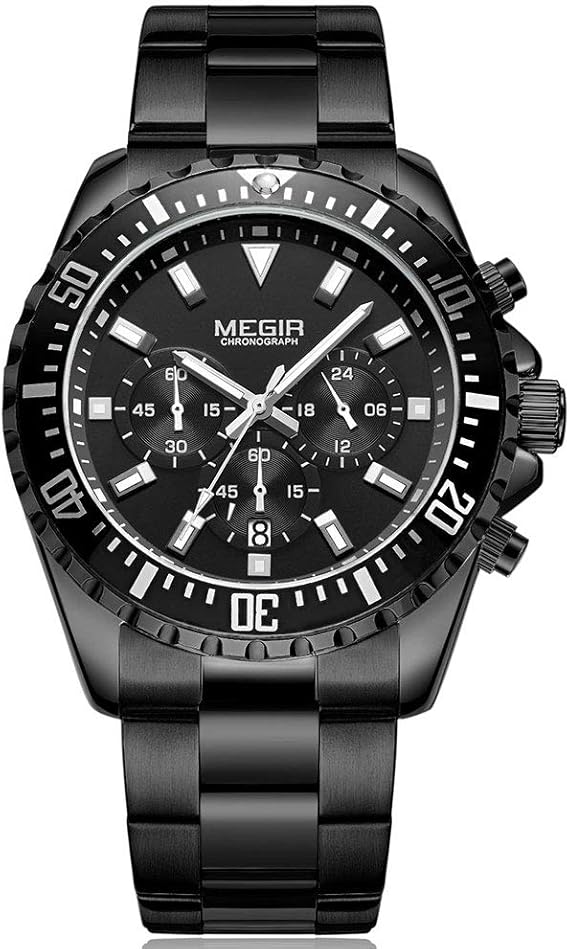 Megir Herren Uhren Wasserdicht Sport Schwarz Edelstahl Gross Armband All Black Chronographe Kalender Leuchtend Amazon De Uhren